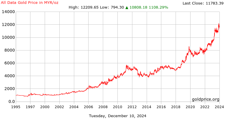 Walaupun harga emas ada turun naik dalam jangka pendek, tetapi sejarah 20 tahun menunjukkan harga emas naik secara purata sekitar 10% setahun. Harga emas confirm akan naik dalam jangka panjang disebabkan faktor inflasi dan kejatuhan ringgit.